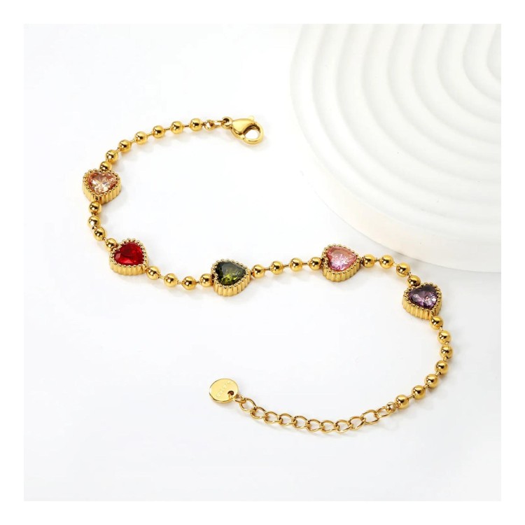 Esalta il tuo stile con il nostro bracciale cuori di zirconia multicolor da 8,6 x 8,6 mm. Il bracciale a catena con perle da 3 mm per una lunghezza di 18+3 cm è abbinato a 5 ciondoli a cuore. Esalta qualsiasi outfit con questo gioiello elegante e versatile.