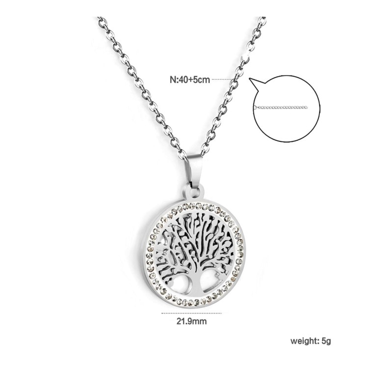 Ciondolo da 21,9 mm, meticolosamente realizzato, con un intricato motivo a forma di Albero della Vita scavato, impreziosito da diamanti bianchi incastonati con precisione. Il motivo simbolico è reso con dettagli eccezionali, creando un equilibrio armonioso tra spazio vuoto ed elementi strutturali. Sospeso a una catena da 40 cm con estensione di 5 cm per un utilizzo versatile. La finitura bicolore acciaio/oro accentua le qualità dimensionali, offrendo al contempo un contrasto sofisticato che eleva questo gioiello significativo oltre il semplice ornamento.
