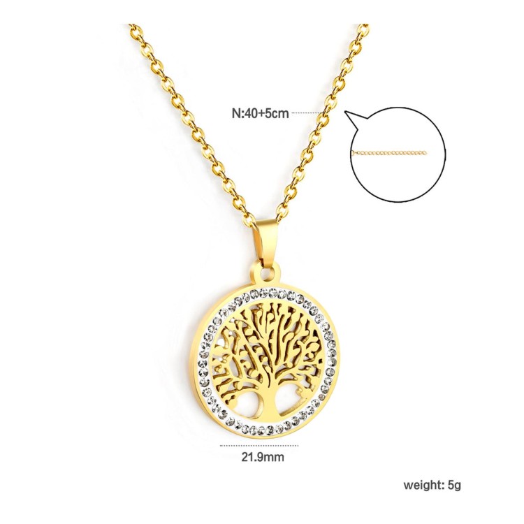 Ciondolo da 21,9 mm, meticolosamente realizzato, con un intricato motivo a forma di Albero della Vita scavato, impreziosito da diamanti bianchi incastonati con precisione. Il motivo simbolico è reso con dettagli eccezionali, creando un equilibrio armonioso tra spazio vuoto ed elementi strutturali. Sospeso a una catena da 40 cm con estensione di 5 cm per un utilizzo versatile. La finitura bicolore acciaio/oro accentua le qualità dimensionali, offrendo al contempo un contrasto sofisticato che eleva questo gioiello significativo oltre il semplice ornamento.