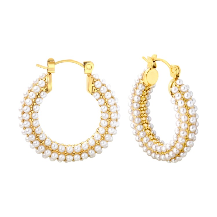 Questi orecchini a gancio color oro da 26x24 mm sono impreziositi da eleganti perle finte bianche, che uniscono la raffinatezza classica al design moderno. La loro struttura leggera garantisce un utilizzo confortevole per lunghi periodi, rendendoli ideali sia per l'eleganza quotidiana che per le occasioni speciali. Le perle lucenti aggiungono un tocco raffinato, valorizzando qualsiasi outfit con un tocco di lusso discreto.