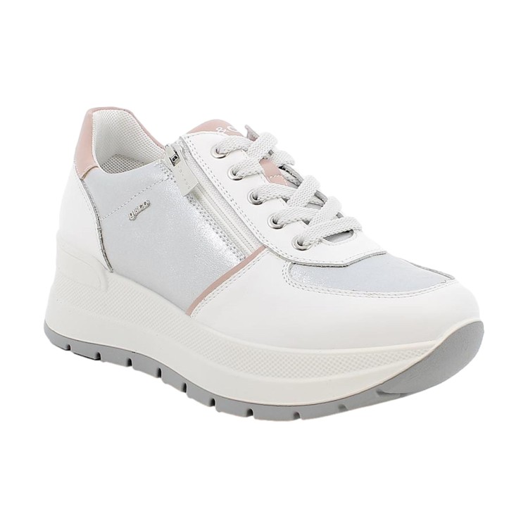Sneakers realizzate in pelle laminata che ne denota la grande personalità. Il dettaglio della cerniera laterale aggiunge un tocco pratico ed estetico, facilitando la calzata. La morbida fodera in tessuto crea un ambiente accogliente e particolarmente confortevole. La suola alta, ma leggerissima, regala centimetri in più.